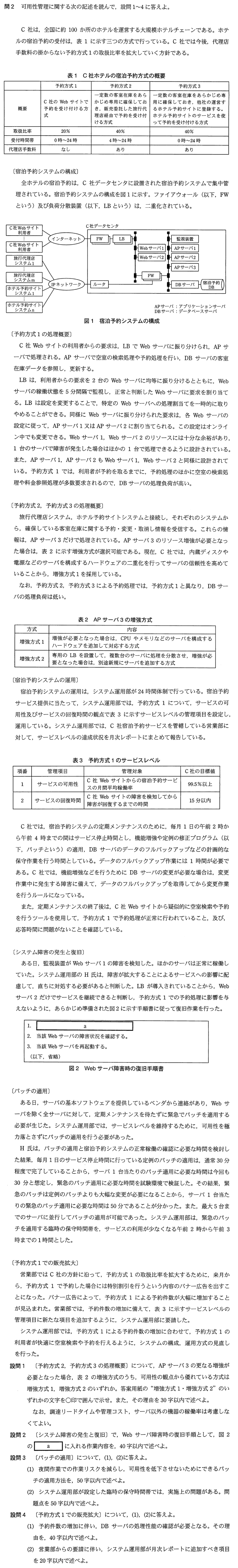平成22年度秋期午後Ⅰ【問2】 X Facebook LINE 2024.04.272024.05.18 設問1解答例 方式: 増強方式 2理由: サービス全体を停止させずにサーバの増強が可能だから 設問2解答例 a. LB(負荷分散装置)の設定を変更して当該 Web サーバへの処理割当てを取りやめる。 設問3解答例 (1) AP サーバ 1 と AP サーバ 2 は昼間の時間帯にサービスを停止させずに 1 台ずつパッチを適用する。 (2) パッチ適用前にデータのバックアップを取る必要があるので,臨時の保守時間帯では作業が完了しない。 設問4解答例 (1) 空室の検索処理や料金参照処理の増加による負荷増加が見込まれるから (2) サービス利用者から見た応答時間