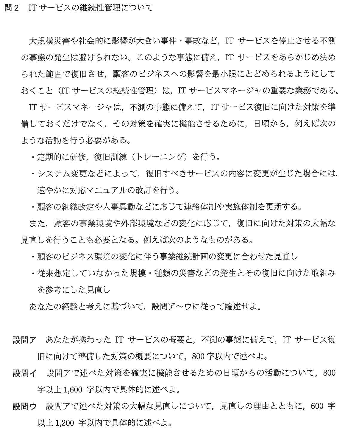 本問は,不測の事態に備えて IT サービス復旧に向けて準備した対策と,その対策を確実に機能させるために日頃から行っている活動について,具体的に論述することを求めている。併せて,顧客の事業環境の変化などに応じて行った,対策の大幅な見直しについても論述することを求めている。論述を通じて,IT サービスマネージャとして有すべき問題分析能力,対策立案能力,改善提案能力などを評価する。