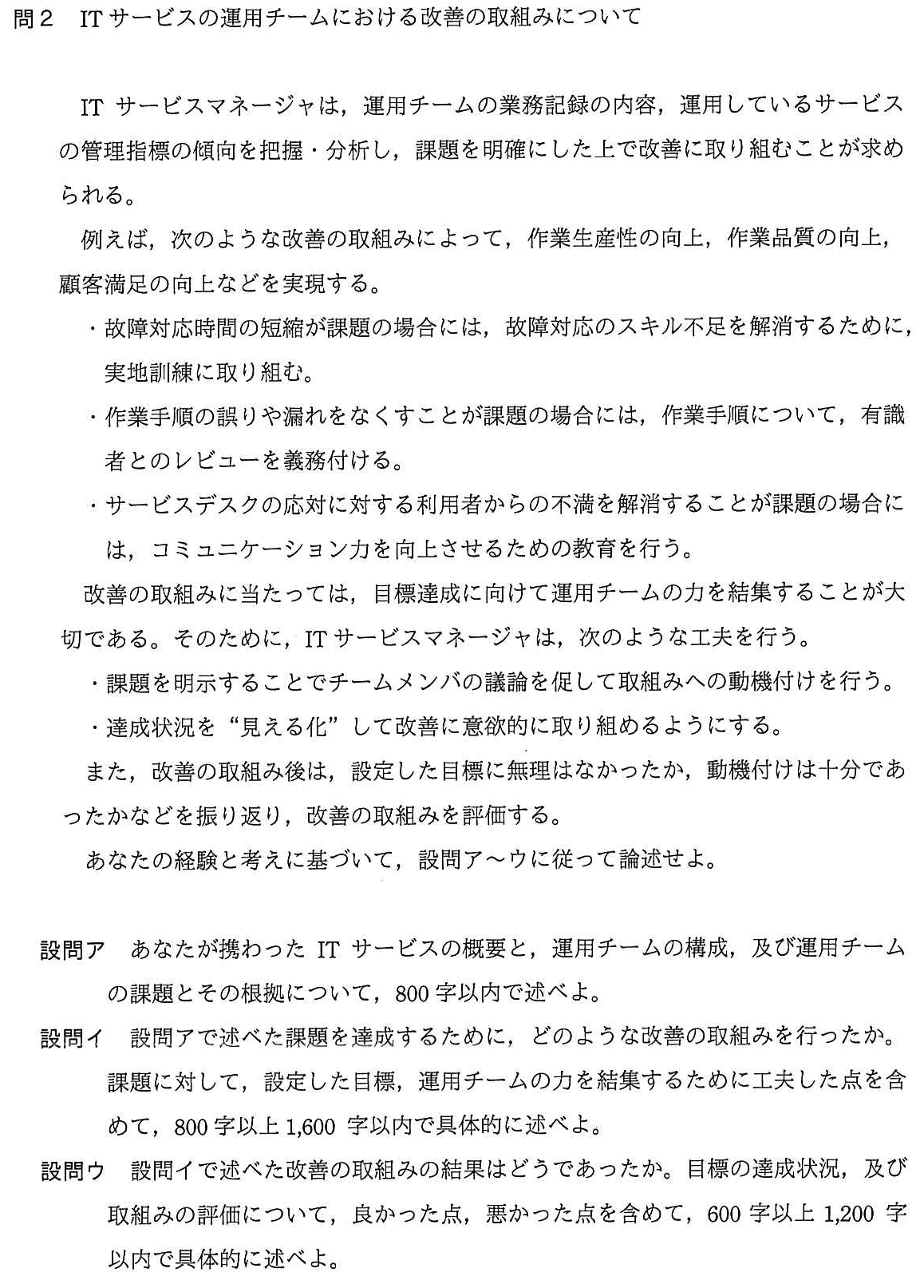 本問は,IT サービスの運用チームの改善の取組みについて問うている。具体的には,IT サービスの概要と運用チームの構成,及び業務記録・管理指標などの傾向を把握・分析することで気付いた課題について論述を求めている。また,課題を達成するためどのような改善の取組みを行ったか,課題に対して,設定した目標,運用チームの力を目標達成に向けて結集するように工夫した点を含めて論述することを求めている。併せて,改善の取組みの評価について,良かった点,悪かった点を含めて論述を求めている。論述を通じて,IT サービスマネージャとして有すべき問題分析能力,対策立案力,マネジメント力などを評価する。